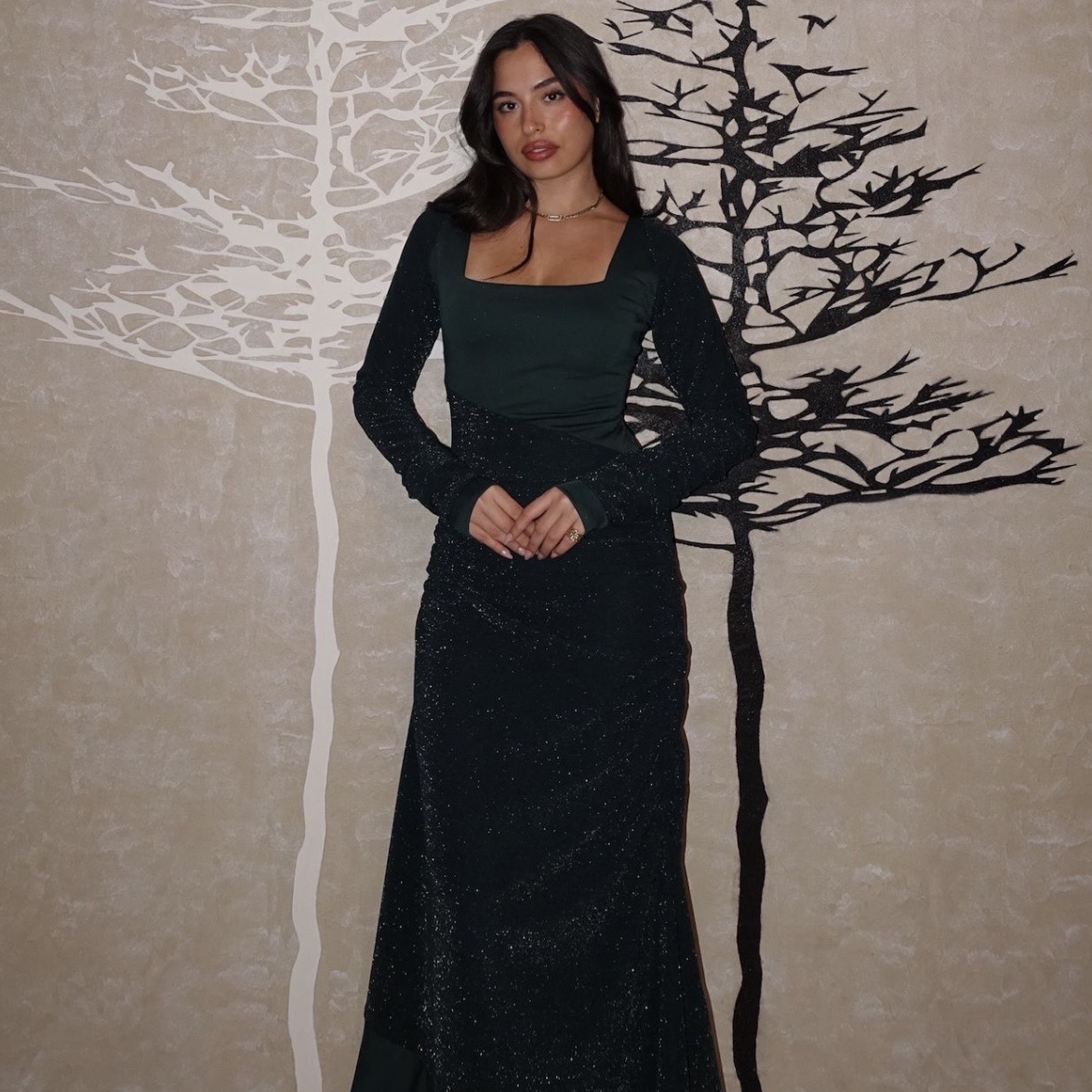 This dress combines a smooth, fitted bodice in a rich deepgreen fabric with a softly shimmering black skirt. The
